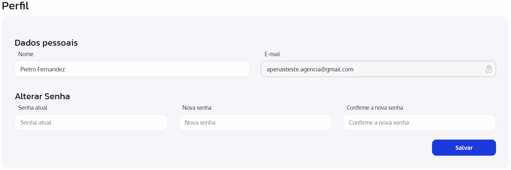 Altere o ‘Nome’ e a ‘Senha’. O ‘E-mail’ não pode ser modificado.